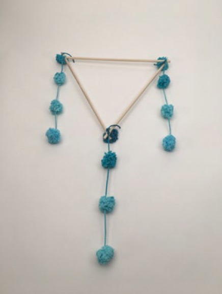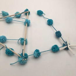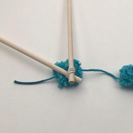 Cut a 4-pompom section of yarn. Tie to remaining point of the bound rods.