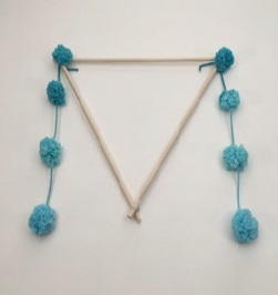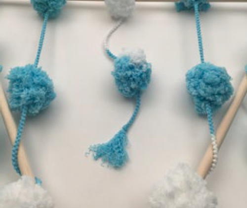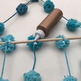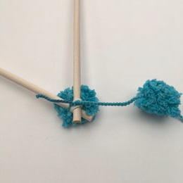 Cut two 5-pompom sections of yarn. Tie to top rod, 4-inches from the sides.