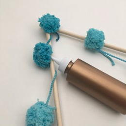 Cut a 2-pompom section of yarn. Tie to center of top rod. Tie loose yarn at end of the bottom pompom and fray the ends to create tassel.