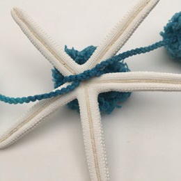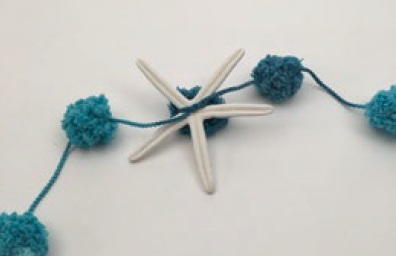 Cut a 7-pompom section of yarn. Place starfish in center pompom, and tie in a knot.