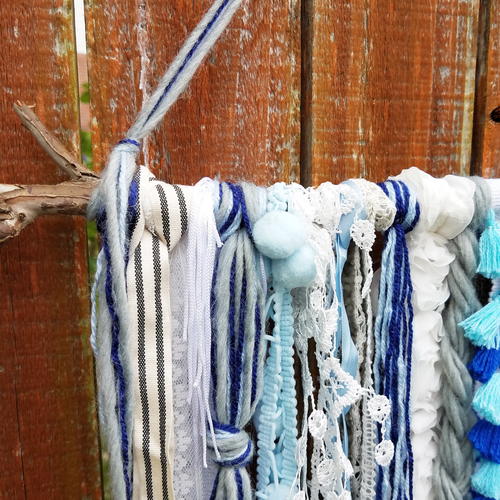 From the Designer: "Using various trims, a stick, and Spinrite yarns you can create a wonderful boho wall decor piece that fits for any color scheme you have in your house by just changing the colors of the yarns and trims. I love blues, so that is the color pallet I chose. You can pick a wide or short stick for this super simple craft. I found a good one in my backyard that had a fun section on the end. It is as simple as tying the trims and yarn onto the stick. You can add some fun knots and braids to the yarn to dress it up, and then it is ready to hang!"