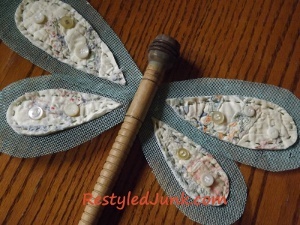 - Place a straight textile spindle over the center-front of the wings for the body. The wider end of the spindle is the head of the dragonfly. Wire the spindle to the wings using craft wire.