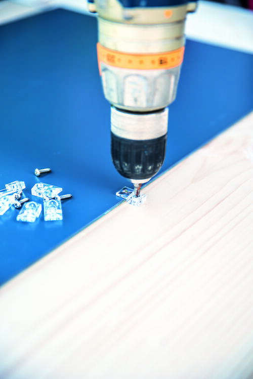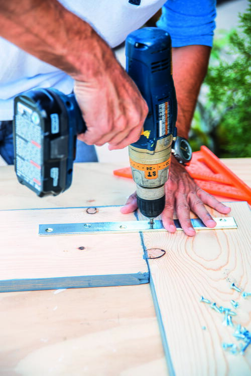 To build the frame, turn it upside down and use the drill to secure the pieces with the 10-inch (25.5-cm) mending plates across the top and bottom using ⅝-inch (1.5-cm) wood screws. If the screws are too long they will damage the front of the frame.