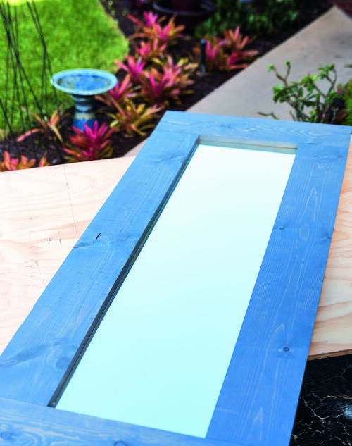 Apply the weathered gray stain with the staining pads and use disposable gloves to protect your hands. The more coats, the darker the stain. Once it is dry, you can give it a finish coat with a polyurethane, which makes it more durable. However, since the mirror will be installed indoors, it is not necessary on this project. I also prefer the matte finish of the stain, which looks more rustic. -