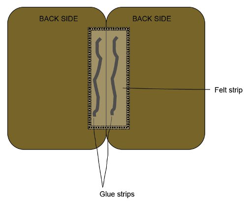 Cut your felt strips about 4 inches wide and 3-4 inches long. Use your glue gun to place one strip of glue on one rectangle and another on the rectangle right next to, above, or below it and then place a felt strip down so it reaches both glue strips and holds the two rectangles together. Repeat until every rectangle is joined to all the rectangles surrounding it.
