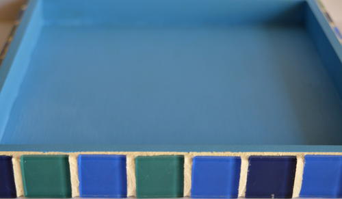 Use the wood glue to add a row of mosaic tiles all around the outer sides of the wooden canvas. Try and space them evenly when gluing them. Allow the glue to dry thoroughly before proceeding to the next step. When the glue is completely dry, you will not be able to move the tiles anymore.