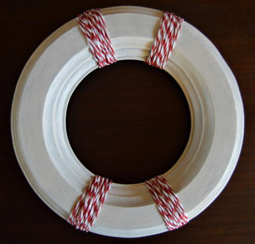 Now turn the frame into a buoy. Add four sections with the red-and-white twine. For the first one, secure the thread with a knot at the back of the frame and add a drop of Super Glue to the knot. Twist the thread a few times around the frame. Add another drop of Super Glue to secure it at the back again and cut off the remaining thread. Repeat three more times to complete the four sections of the buoy.