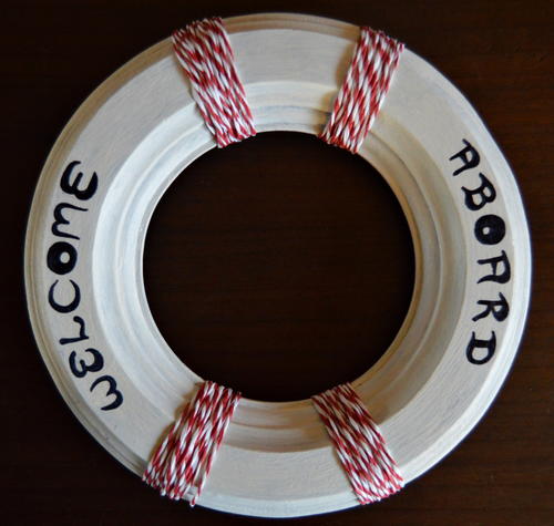 Use the black pen to add the words “Welcome” and “Aboard” to the left and right sides of the buoy. Let it dry.