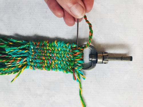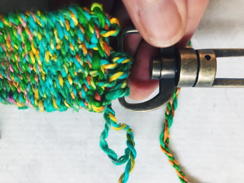 Thread about 18 inches of yarn onto needle. Whip stitch the warp loops onto the keychain. Sew over the tail from the start of the weaving: Place the tail ends along the top of the weaving and below the key chain bar. Stitch over the tail pieces to cover, protect and conceal the tail ends.