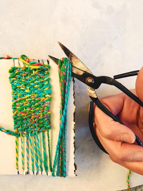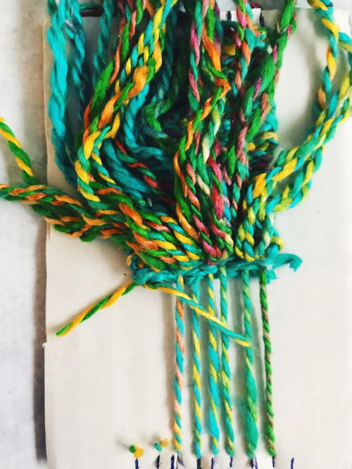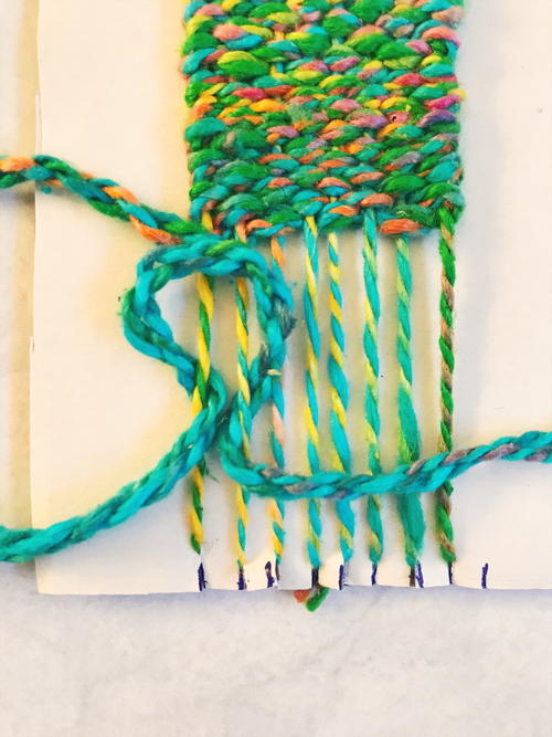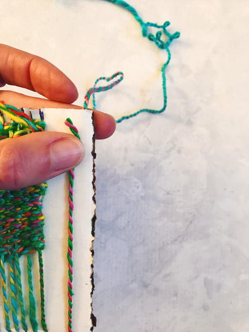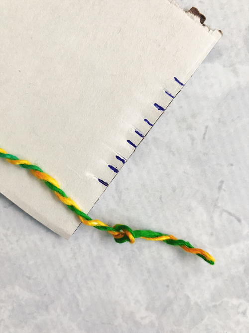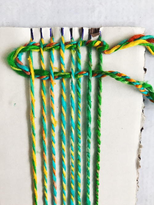Tie a knot at the end of the yarn. Slip the yarn into the first slit of the loom (bottom left corner). Pull yarn up to the top of the loom, slip yarn into top left slit and around the back of the first notch, then bring the yarn down the front of the loom to the next bottom notch and repeat, ending at the bottom right corner. The warp strands go around the notches and stay on the front of the loom (they don’t go down the back of the loom). Tie a knot at the end of the yarn and trim.