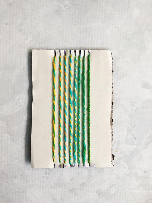 Cut a sturdy piece of cardboard into a rectangle measuring 3” x 5”. Cut 8 notches along the top and bottom approximately 1/8” apart. The top and bottom notches should align; use a ruler to make notches that line up straight.
