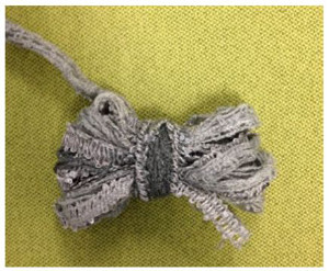 - When you have an end of about 18”, pinch center of wraps, remove from fingers, and wrap the loose end firmly around center of figure eight; pull end through the center wraps to hold. You will be able to pull more yarn from the bobbin as needed while doing your knotting.