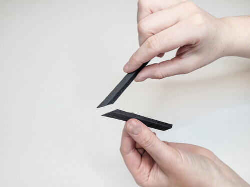 Lay the triangular-shaped bevel along the edges of the headpiece to measure how long they should be, and cut to the right lengths. In order to achieve nice pointy corners, make sure to cut the ends diagonally. You should end up with 18 pieces.