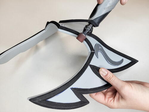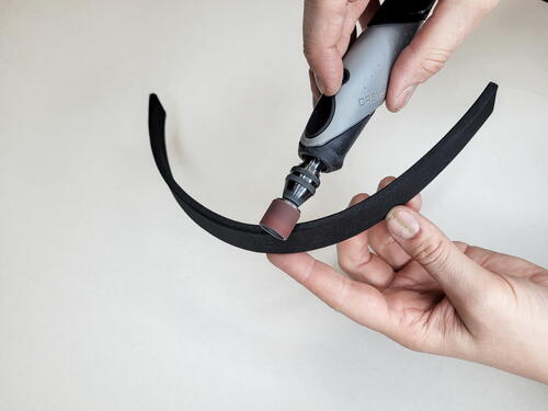 Using the rotary tool with 120-grit sanding drum, sand the edges of the headpiece smooth. The transition between the glued-on bevels and the headpiece will get super smooth in this step. Also sand the edges smooth of the strip of foam that will be used for the headband to make it softer. The result of the sanding will look nicest when using a rotary tool, but you can also use regular sandpaper for this job. After the sanding is done, clean the foam piece by removing all of the dust. -