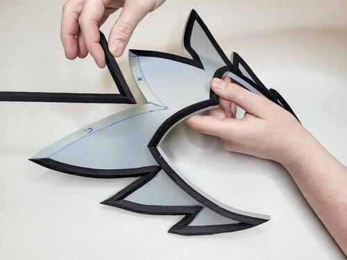 Using the paper pattern, trace and cut the headpiece base out of the 6mm EVA foam. Cut out the swirly details twice (once mirrored) using the 2mm EVA foam.