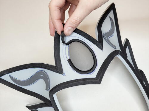 The sides of the headpiece should sit snug against your cheeks. If the shape isn’t right just yet, heat the foam again and shape it further. If you want to keep it simple and don’t want to add edging and details, move on to step 5 next and then skip the faux gemstone too. -