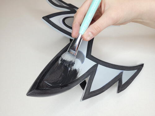 Prepare the headpiece for priming and painting by heat-sealing it with the heat gun. Try to avoid heating the foam clay as much as possible, since it can get damaged. When the foam is cool, apply the black flexible primer to the headpiece. Cover the complete front of the piece and most of the back too. You can leave the parts that will be sitting against your skin (forehead) unprimed for comfort reasons. Also prime the outside of the strap on the back. Use as many coats of primer as needed until you like how the surface looks. I used two layers of HexFlex black. Leave the primer to dry for 2 to 4 hours. -