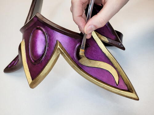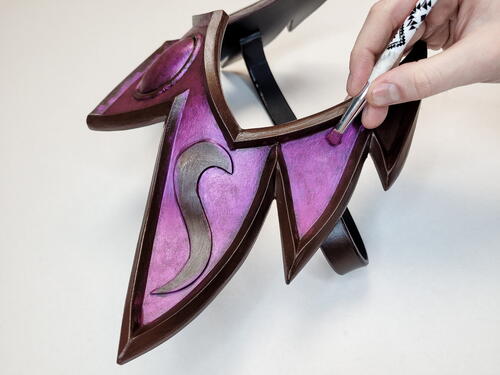For the main color, I used a metallic purple acrylic paint (Sangria Purple from Cospaint). Dab it on with a brush to get a nice layer of paint. Leave the edging and details unpainted for now, and stay away from the corners so the shadow color still shows through. Acrylic metallic paint usually dries quickly, so leave it to dry for 1 hour.