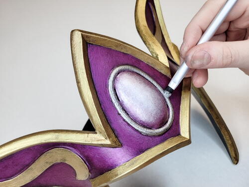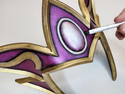 To make the gem stand out, dab some pearlescent paint on it. (I used Pearl White from Cospaint.) Just use a little bit of paint on the brush, and add more layers to make it pop even more. Leave this paint to dry for 1 hour.