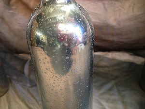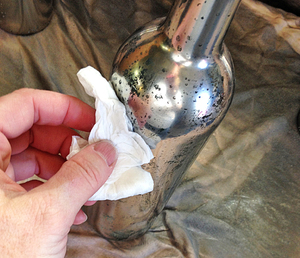 - Spray Looking Glass paint directly over the vinegar mist. Use a paper towel scrunched up that has been misted with the vinegar mixture to blot the bottle. The harder you rub, the more paint with come off. Rub lightly in some areas and harder in others.