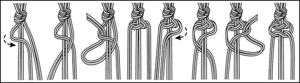 - For each planter, fold two of the 1 ½ yard segments in half and wrap them around the bottle’s neck; secure with a standard double knot. Repeat this process three times, so that you have a total of four groups of strands around the neck. Space them equally around the bottle. Tie a single square knot (FIG. 1) at the top of each cluster.