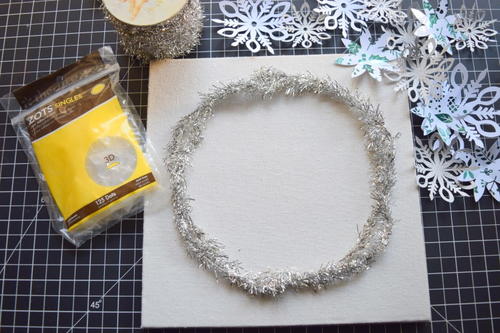 Decide on shapes for wreath, choosing a mix of snowflakes and flowers. Cut enough snowflakes from white cardstock and glitter cardstock to fill wreath.