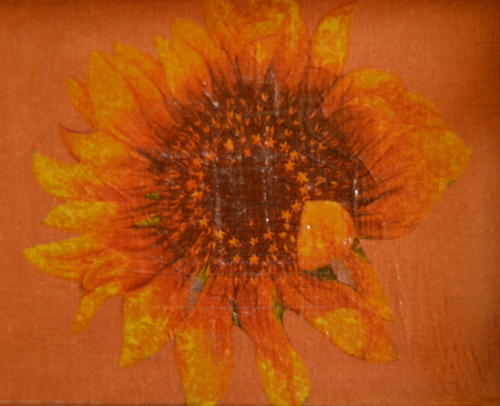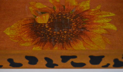 Position the sunflower on the inner bottom of the tray and paint a substantial amount of Modge Podge over the top of the sunflower, so that it will stick to the tray. As the napkin can stretch or tear easily, it is best to start painting from the middle of the sunflower towards the sides, and working in small triangles. The Modge Podge must only be applied to the top, and must not run underneath the napkin.